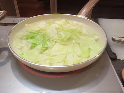 ② キャベツはざく切りにして、熱湯で軽く茹で、きゅうりは千切りに。豚肉は湯通しをして、冷水に取ります。