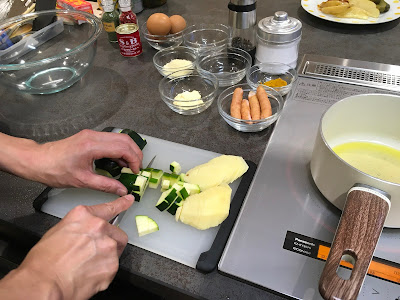 ① ズッキーニは1cm角に切り、じゃがいもは薄切りにして、ウィンナーは5mm程度の厚さに切っておきます。